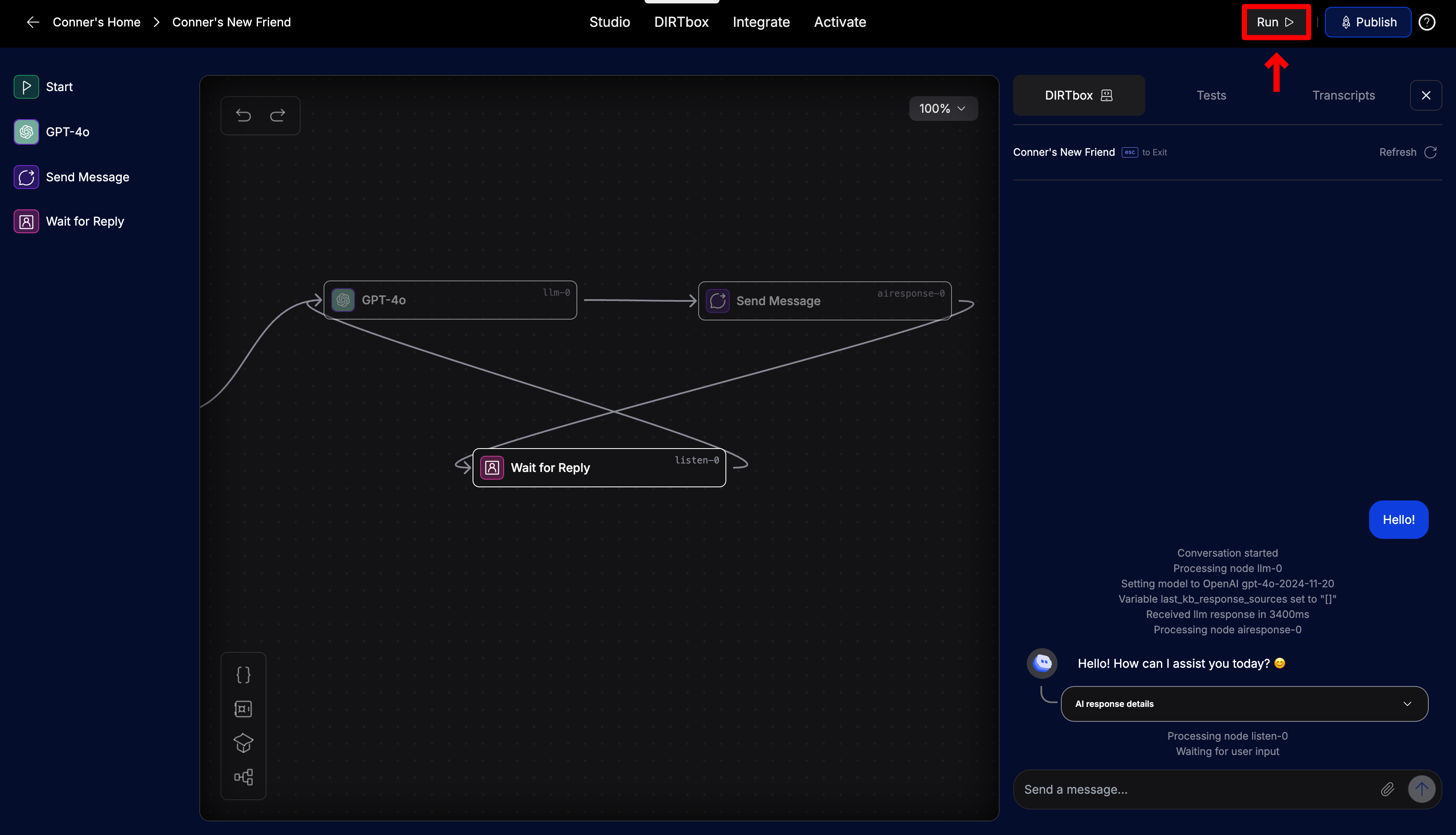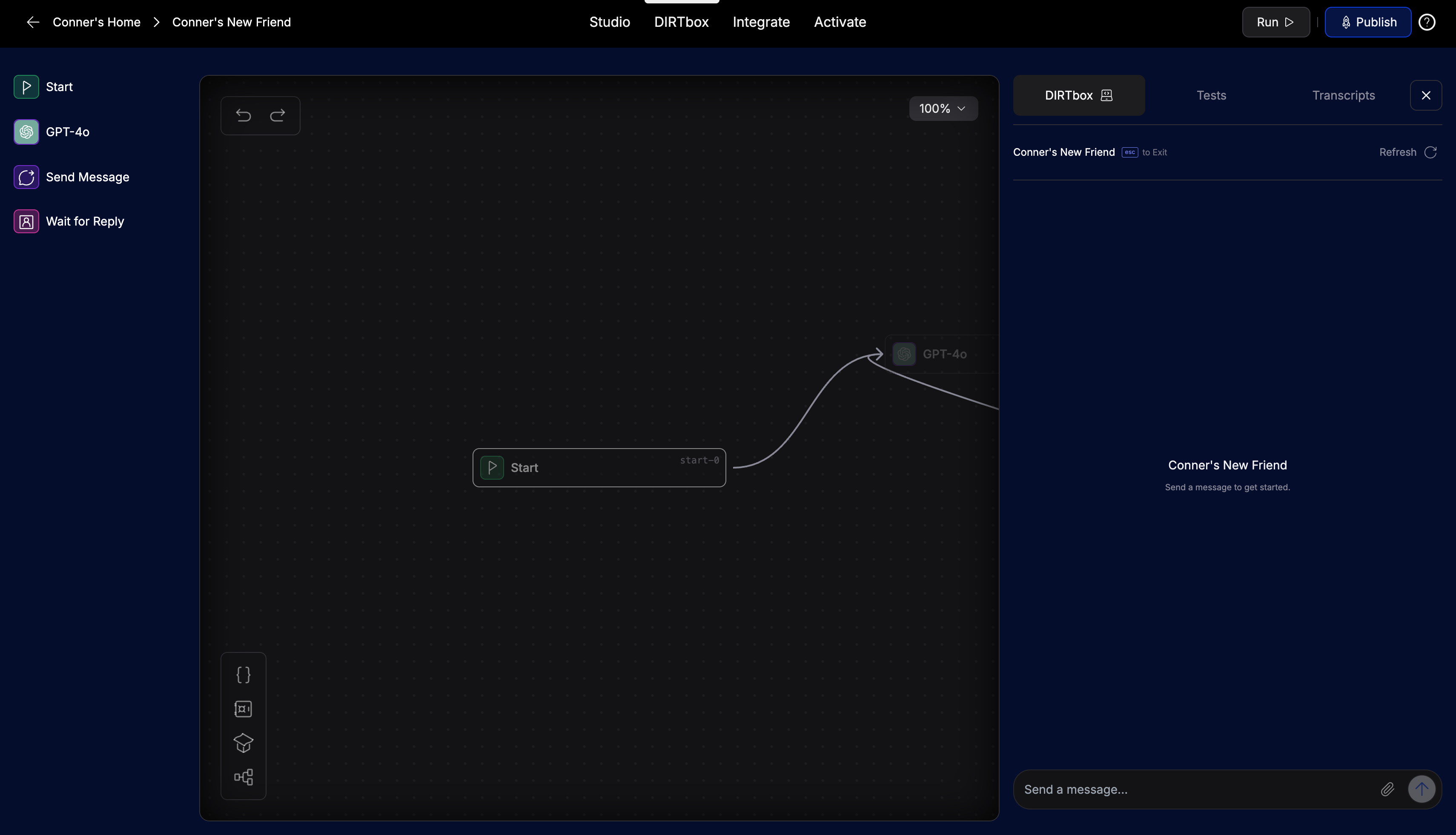 The DIRTBox tab is your assistant's playground—a place where you can interactively test your chatbot just like a real user would. This is where you see your flows in action, catch issues early, and make sure everything works as expected before going live.